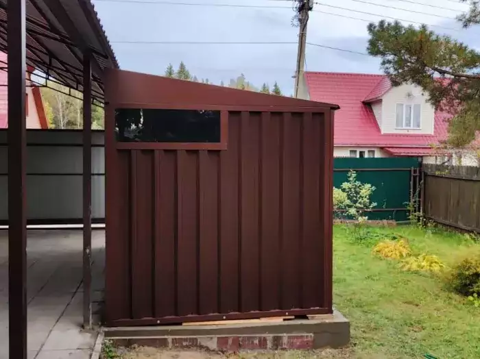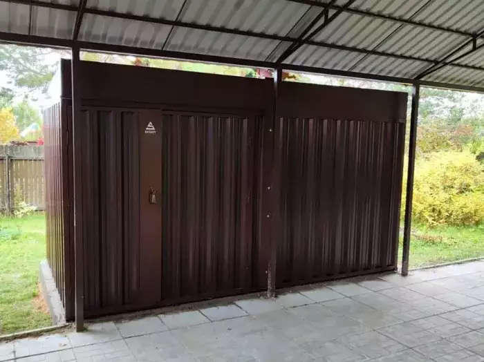 Контейнер 4 м в цинке (на краску на такой парковке нужны были бы противопожарные сертификаты) с плоской крышей (чтобы минимизировать высоту контейнера). Доставка была в разобранном виде на низком бортовом Hyundai Porter, чтобы проехать под ограничением по высоте в 2,1 м. Сборка осуществлялась на месте с учетом неровной поверхности подъемного машиноместа и ограниченного пространства.