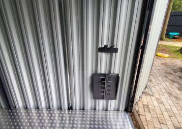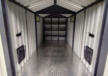 Также постройку укомплектовали стеллажами, пандусами для комфортного въезда техники, упорами для распашных ворот, антивандальным засовом и двумя световыми окнами размером 90 х 30 см для проникновения естественного света внутрь постройки. Все аксессуары, кроме упоров, были также выполнены в графитовом цвете RAL 7024.
