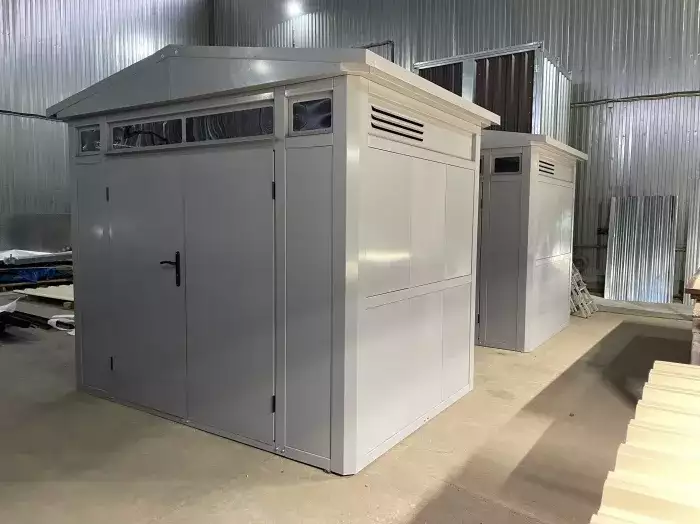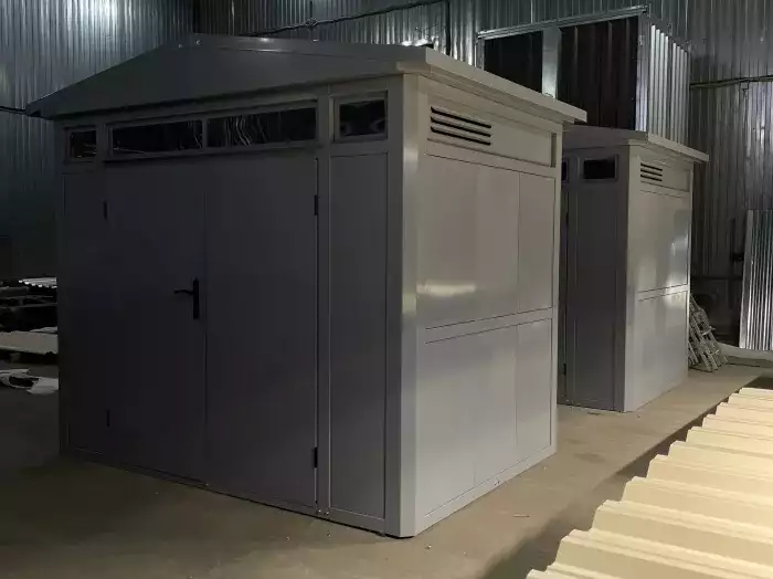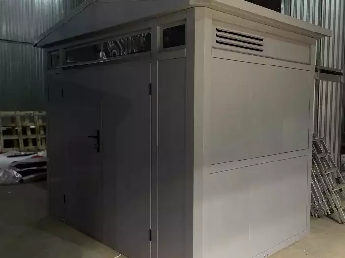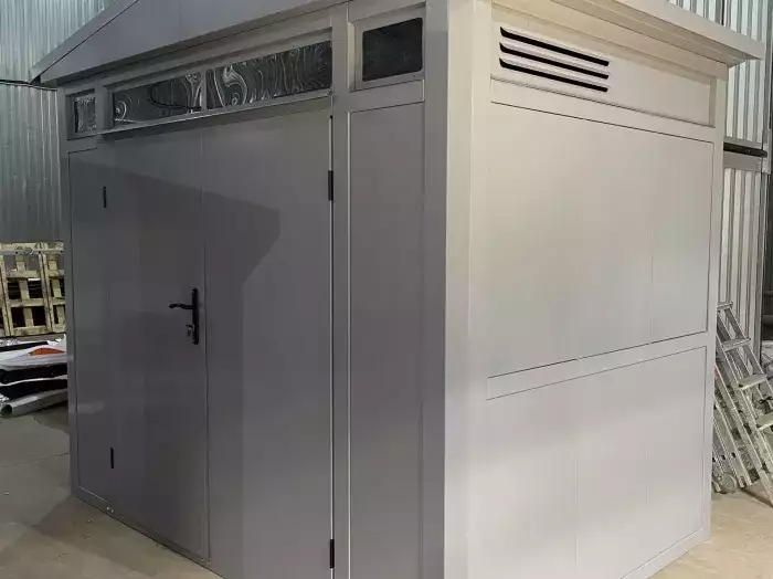 Изготовили 4-метровую конструкцию с плоской крышей и торцевой воротной группой в неизменно популярном графитовом цвете RAL 7024.