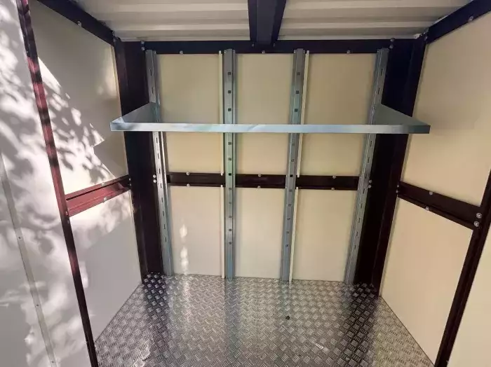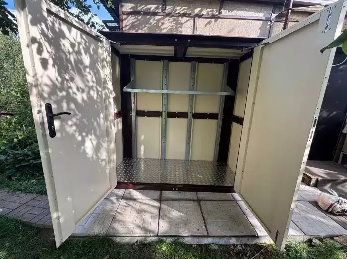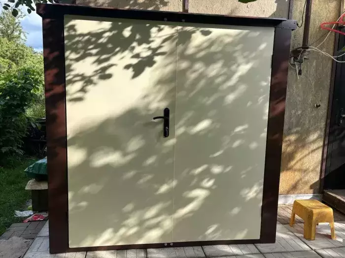 Нами была изготовлена нестандартная конструкция размером 2,4 х 2,16 х 2,45 м с односкатной крышей и торцевой входной группой с рольставнями в нежном цвете RAL 1014 «слоновая кость». Выбор в пользу этой расцветки был сделан для того, чтобы хозблок гармонировал по цвету с жилым домом на участке.
