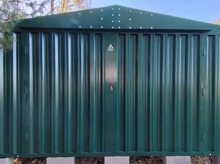 Стильный хозблок в темном антрацитовом цвете с фирменным логотипом по спецзаказу. Привезли в разобранном виде на участок в КП Гранд Марина Клаб, Можайского района, Московской области. Поставили контейнер на заранее подготовленную площадку. Сейчас он бережно хранит садовый инвентарь.