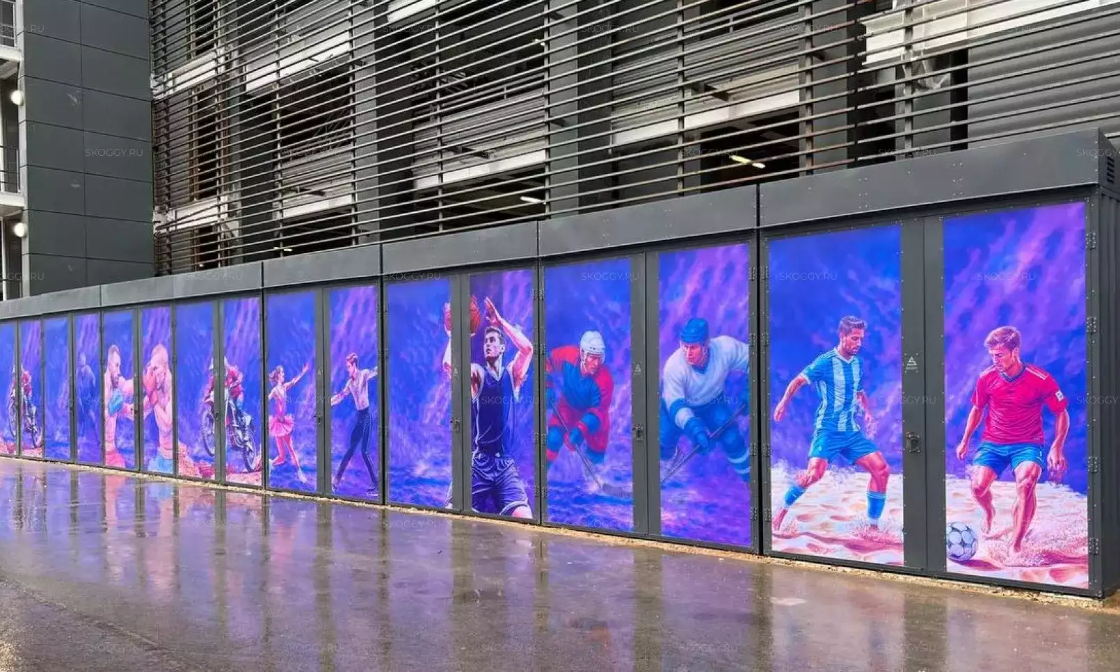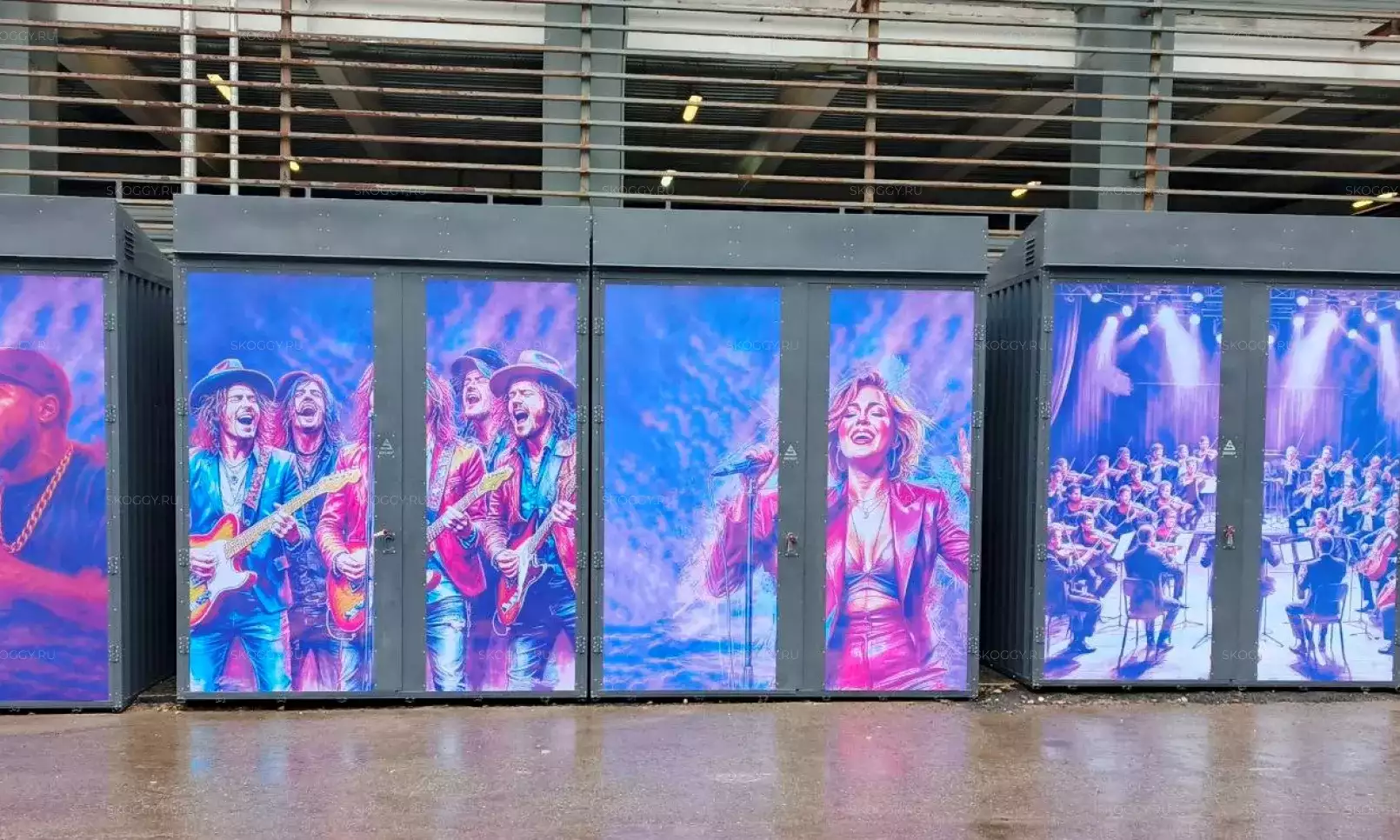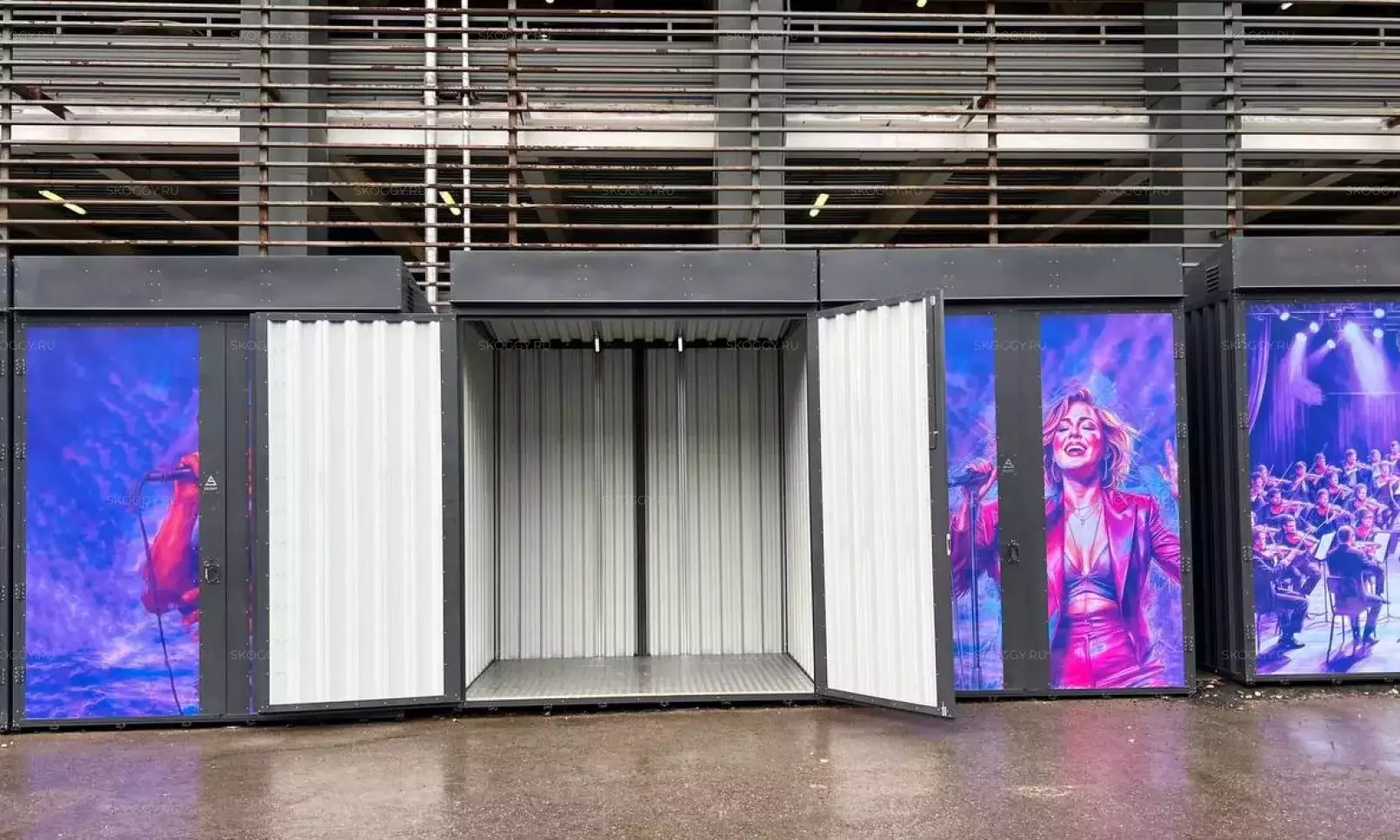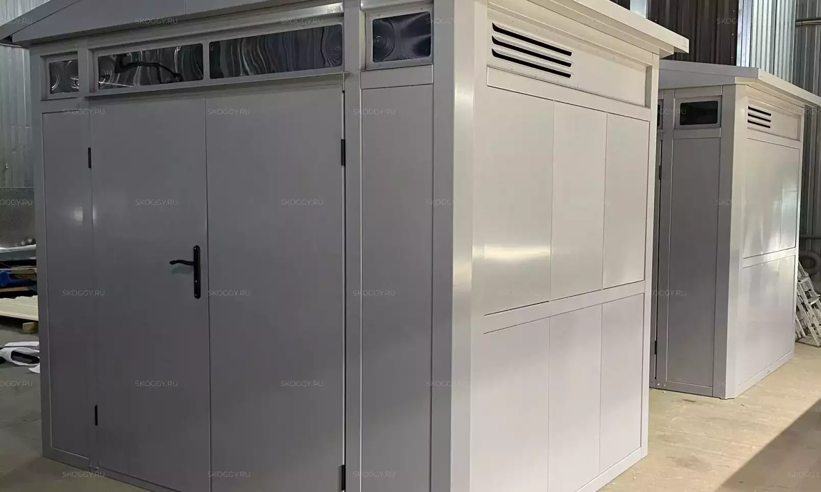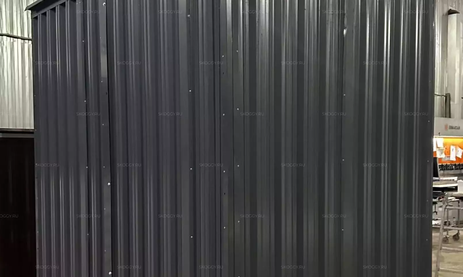 Проект: 3-метровый хозблок для хранения садовой техники и инвентаря в шоколадно-коричневом цвете с нанесением принта.
