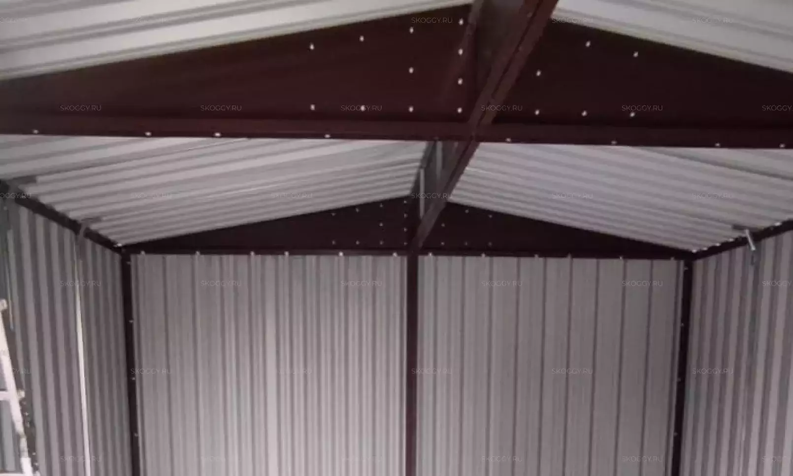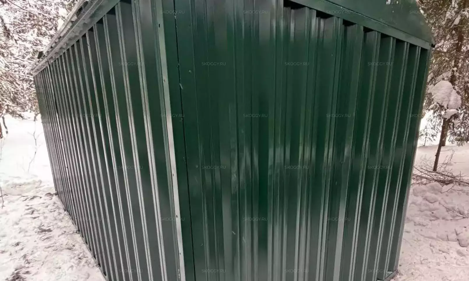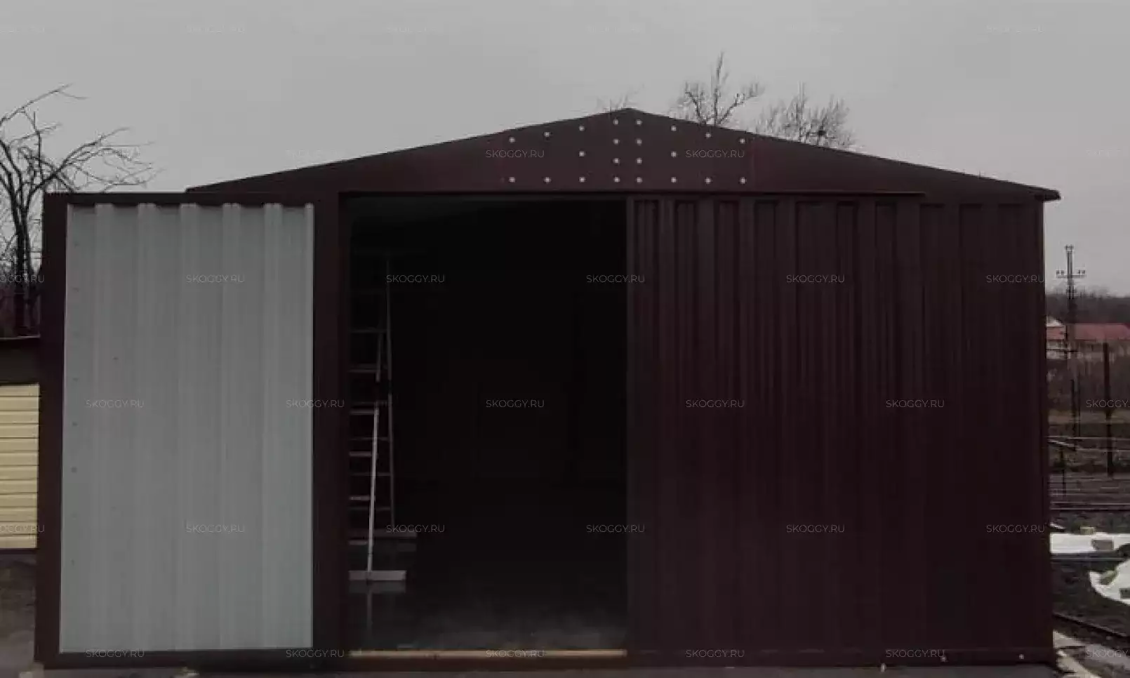 Нами была изготовлена стандартная 3-метровая конструкция с двускатной крышей и торцевой воротной группой в популярнейшем шоколадно-коричневом цвете RAL 8017.
