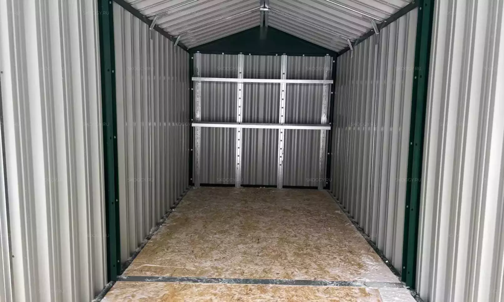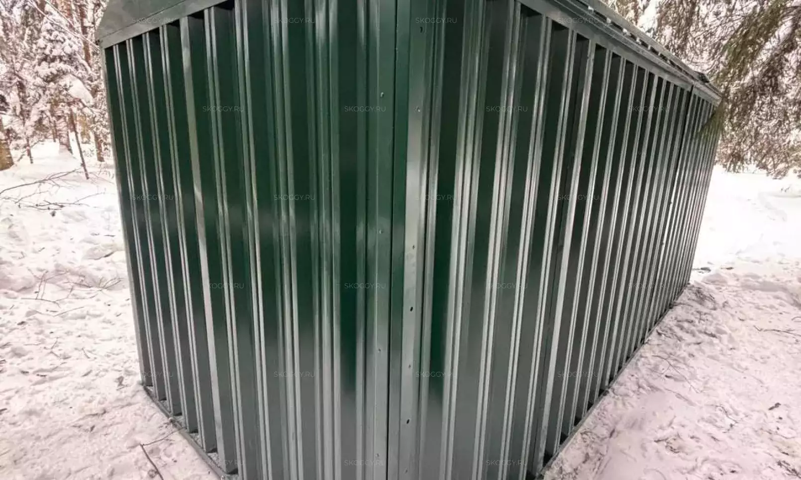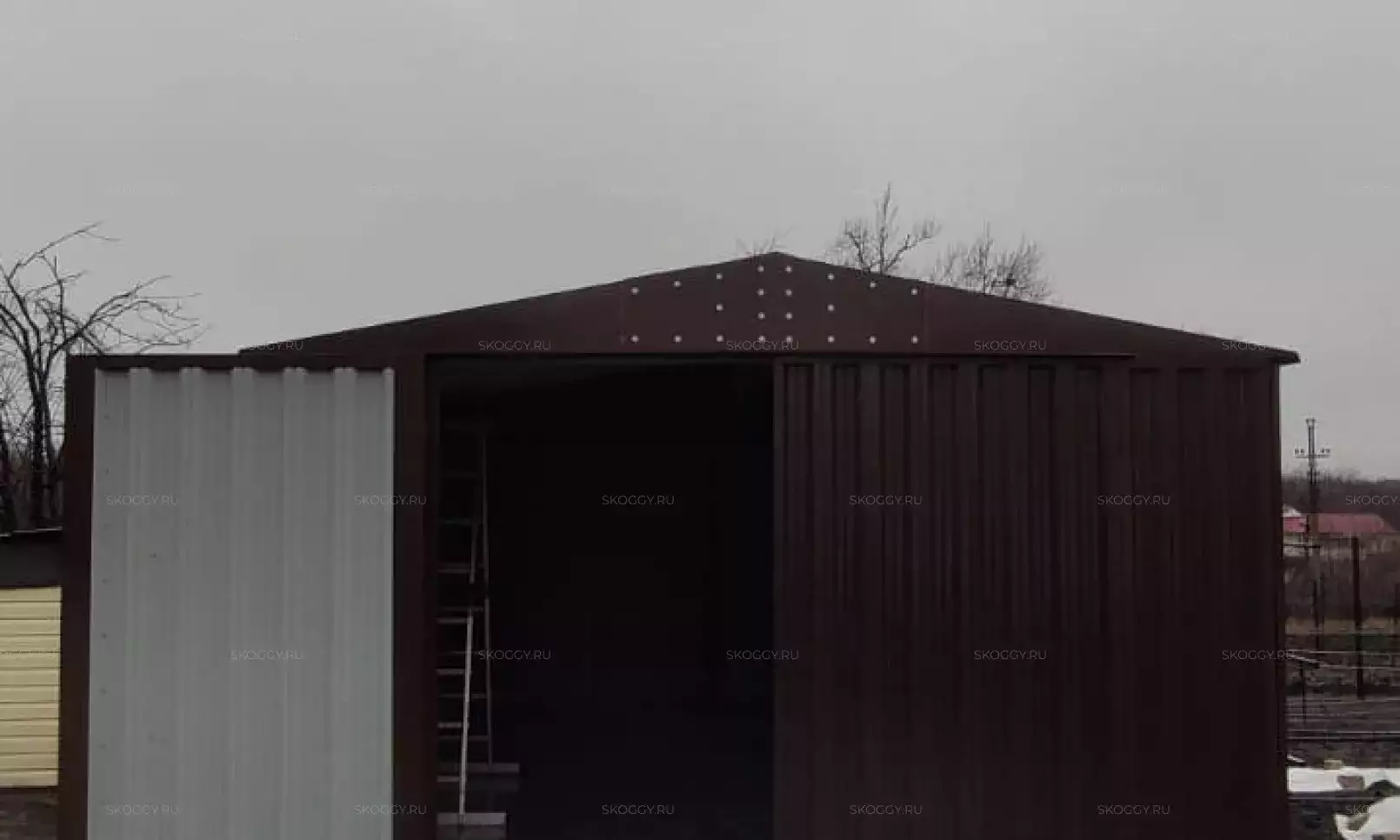 Нами была изготовлена секционная 3-метровая конструкция с односкатной крышей и торцевой воротной группой в потрясающем сочетании расцветки «под дерево» Дуб 3Д для основных элементов и шоколадно-коричневого RAL 8017 для фасонных элементов и крыши.