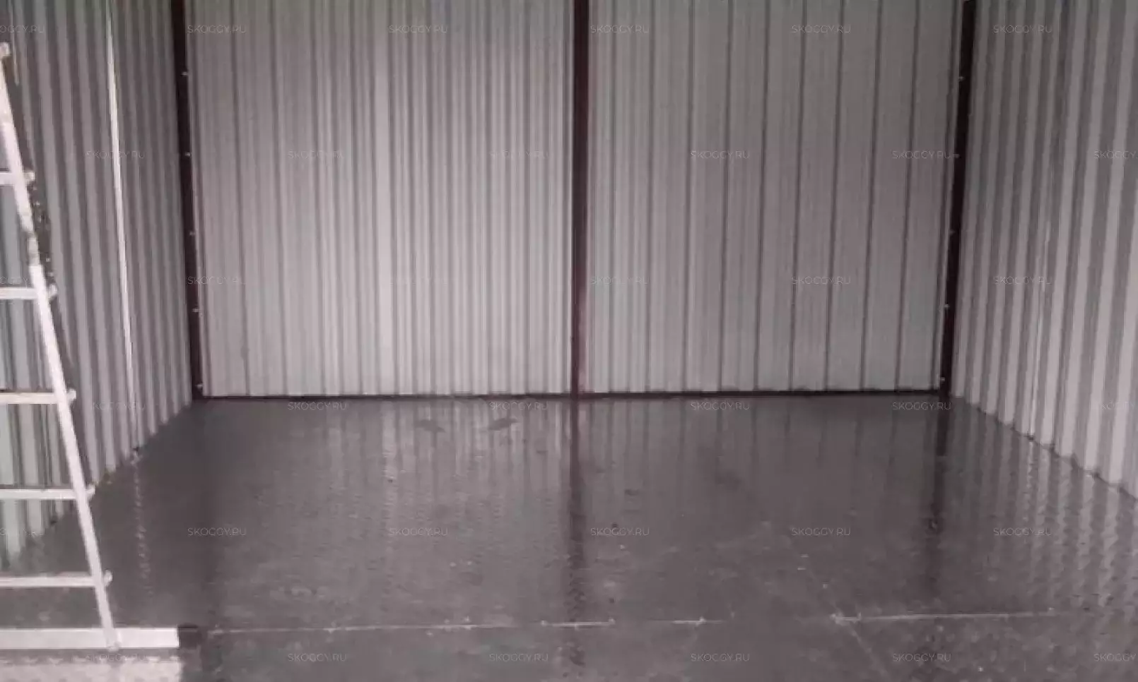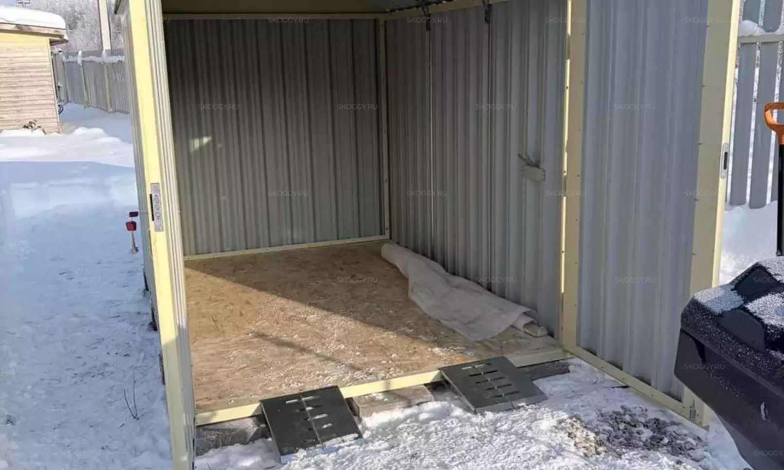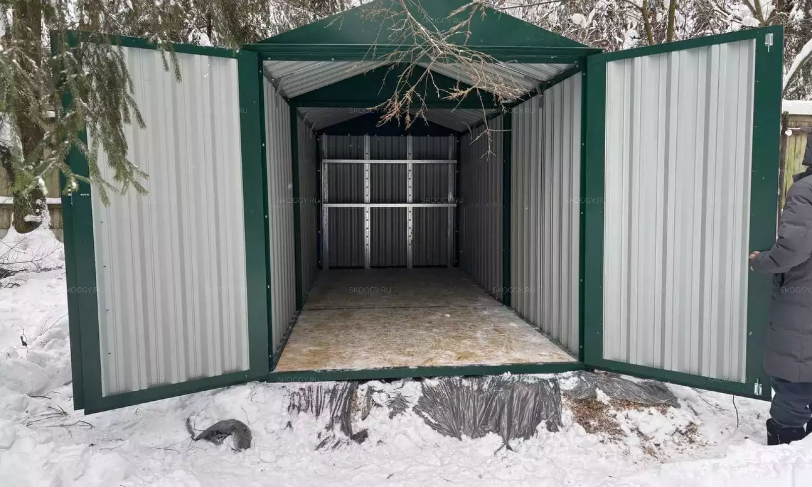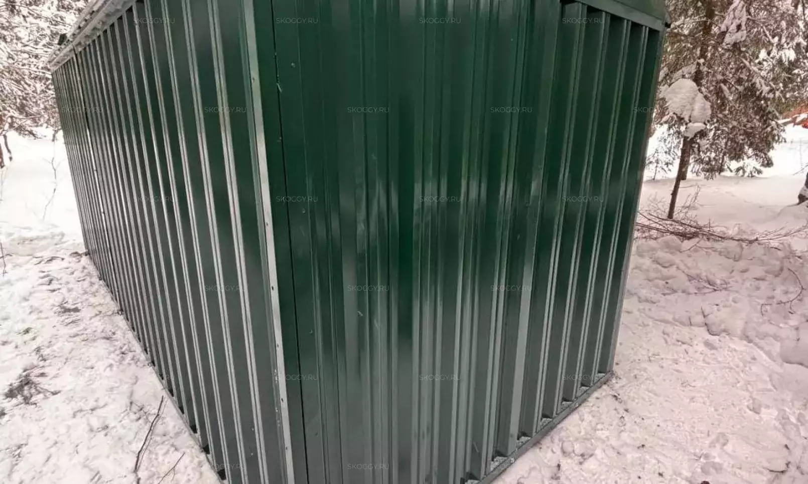 Нами была изготовлена секционная 3-метровая конструкция с односкатной крышей и торцевой воротной группой в потрясающем сочетании расцветки «под дерево» Дуб 3Д для основных элементов и шоколадно-коричневого RAL 8017 для фасонных элементов и крыши.