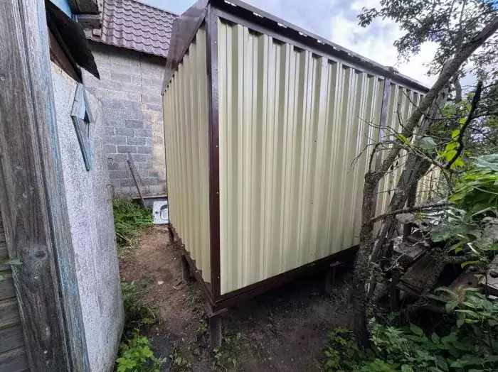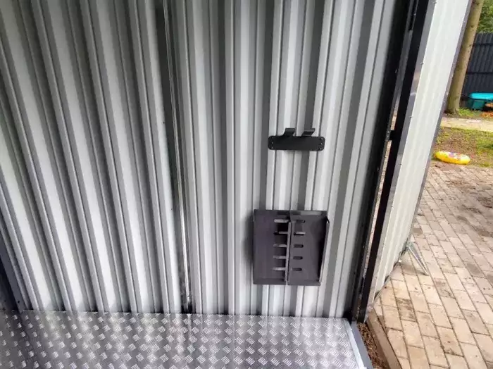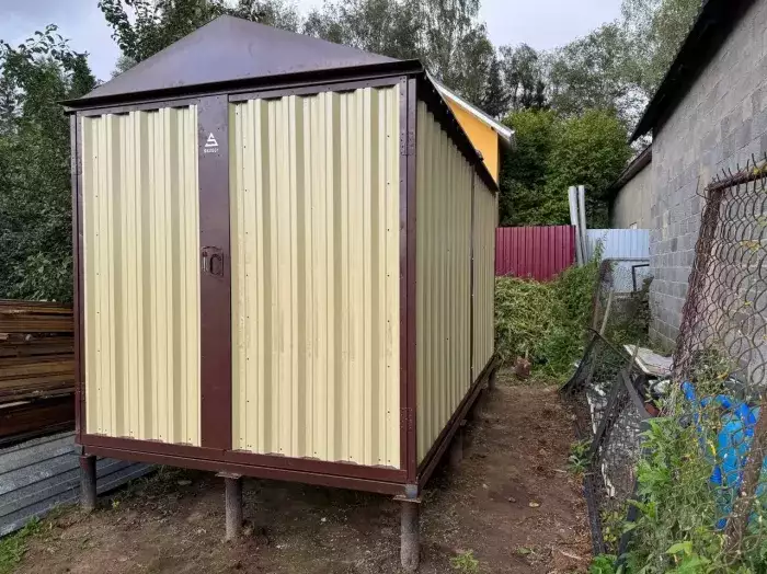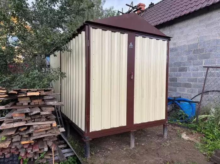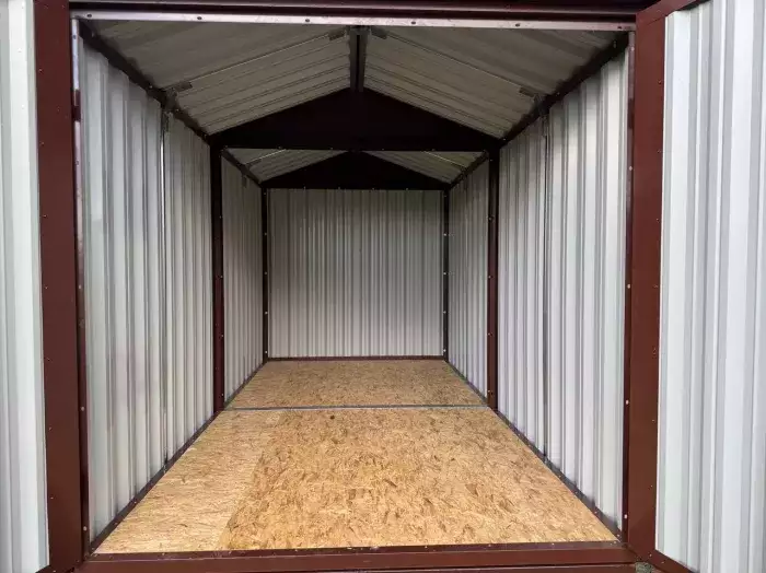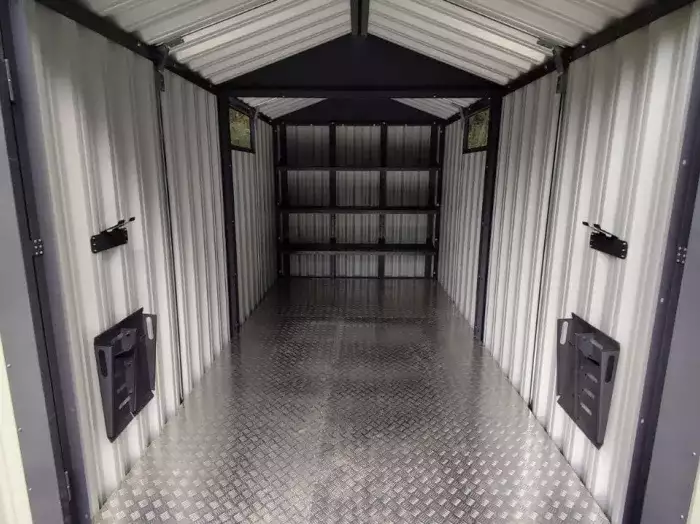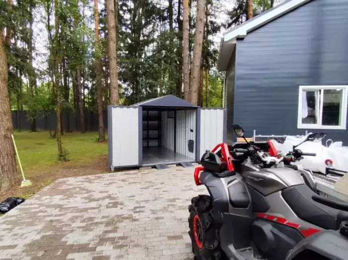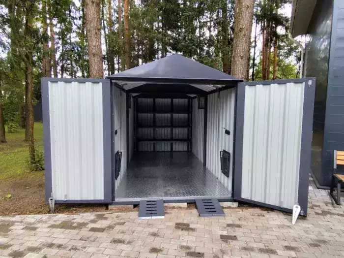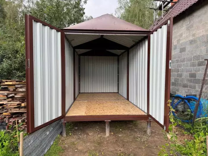 Также в проект включили дополнительную дверь сбоку и укомплектовали системами хранения: прямым и угловым стеллажами, а также инструментальной панелью. Постройка получила один из популярных расцветок – прекрасный шоколадный цвет RAL 8017.